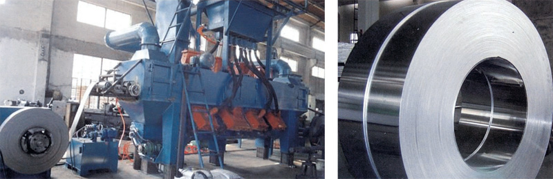 带钢经开卷人工送至夹送带钢抛丸机上,穿过抛丸清理室,至收卷。利用高效悬壁离心式抛丸器将弹丸高速抛射到被清理工件表面上。对工件进行冲击刮削,以清除工件表面的铁锈、氧化皮及其它污物。然后利用钢丝刷、吸气管将工件表面的浮尘吸干净。从而达到提高钢带的抗腐蚀能力、抗疲劳性能、延长其使用寿命、优化钢带的表面工艺状态。本机既可单机使用,亦可组线使用。